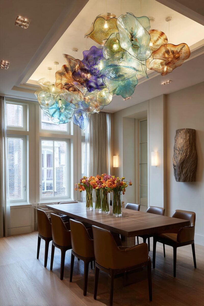 Hand-blown glass pendants arranged in clusters create stunning focal points that look like floating art installations above your dining table.