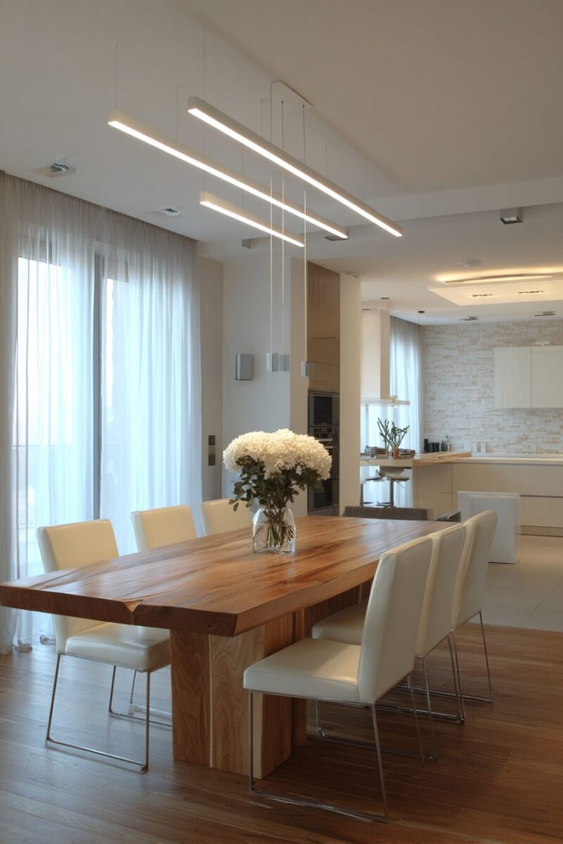 You’ll love how linear lights distribute even illumination across the entire length of your dining table, eliminating those annoying dark spots that single-point fixtures often create.