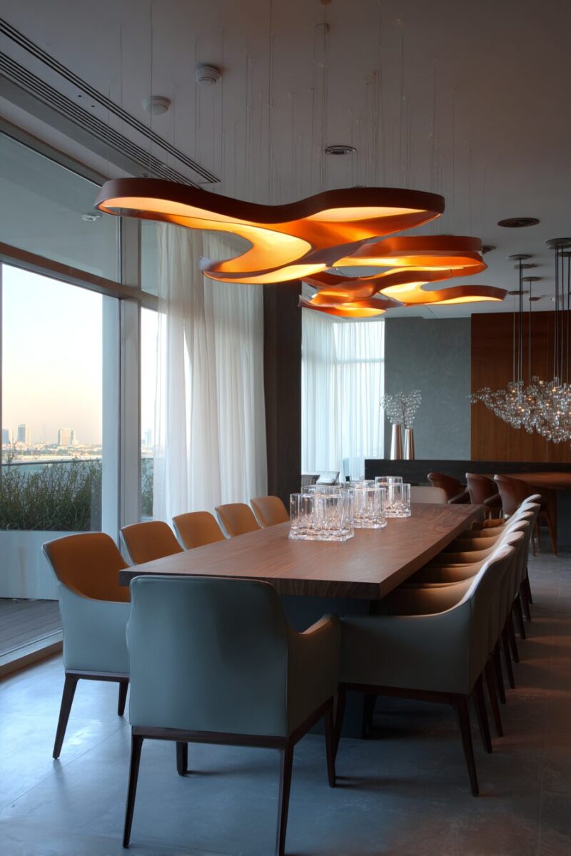 The beauty of a statement chandelier lies in its ability to anchor your entire dining room’s aesthetic while providing the perfect amount of ambient lighting for intimate dinners.