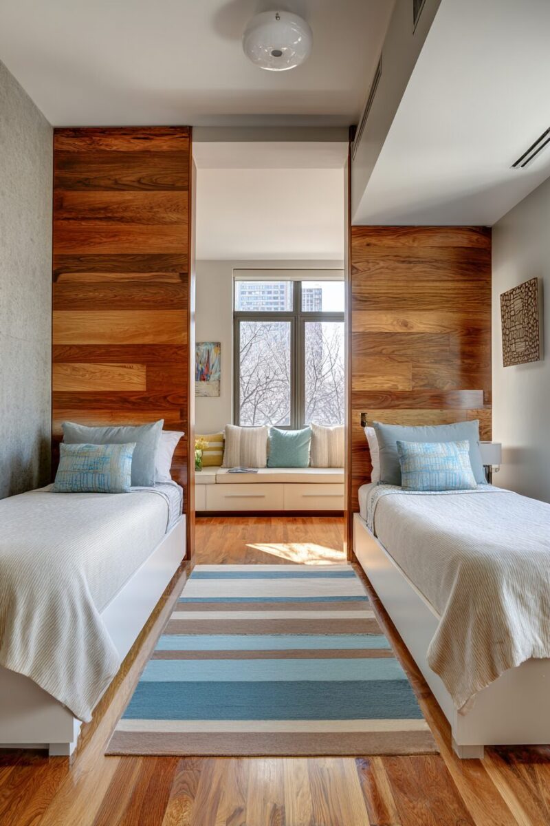 Your shared bedroom gains sophisticated separation when platform beds are designed with built-in divider walls that create distinct sleeping areas.