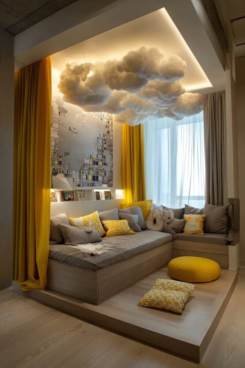 The divider walls between platforms can be customized with various materials – wood panels for warmth, upholstered sections for comfort, or even integrated shelving for shared books and games.