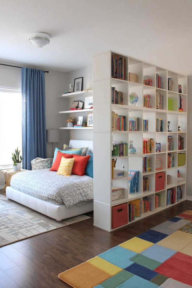 This solution kills two birds with one stone – creating necessary separation while adding valuable storage space that growing kids desperately need for their expanding collections of books, games, and treasures.