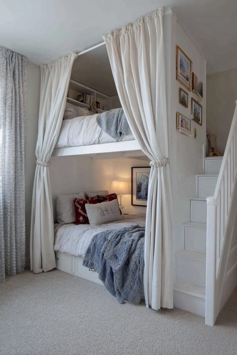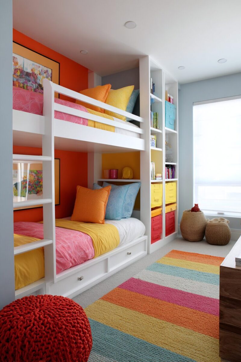 Storage solutions integrate seamlessly into the design, with built-in drawers, cubbies, or hanging organizers that keep each child’s belongings separate and organized.
