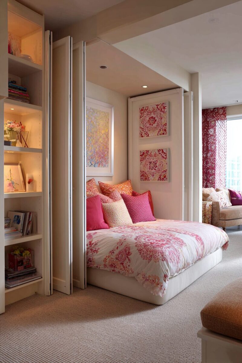 The beauty of this approach lies in its subtlety – visitors see a thoughtfully designed room rather than an obviously divided space, maintaining the bedroom’s aesthetic appeal.