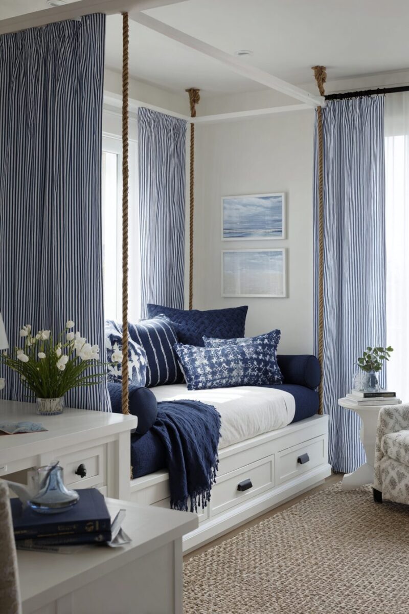 Different fabric weights and textures create varying levels of separation – lightweight voiles provide gentle boundaries while heavier canvas or denim panels offer more substantial division.