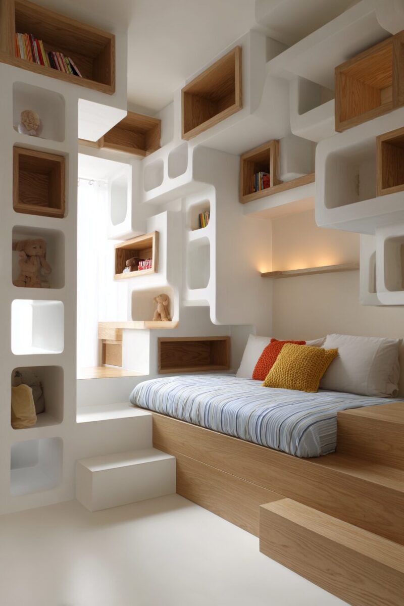 The space underneath platforms can be utilized for additional storage, play areas, or even pull-out desks that maximize the room’s functionality.