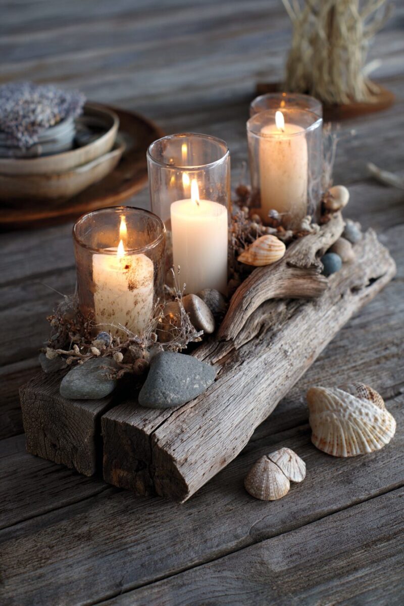 For a more dramatic look, try drilling several holes in a larger piece of driftwood to create a multi-candle centerpiece that’s guaranteed to start conversations.