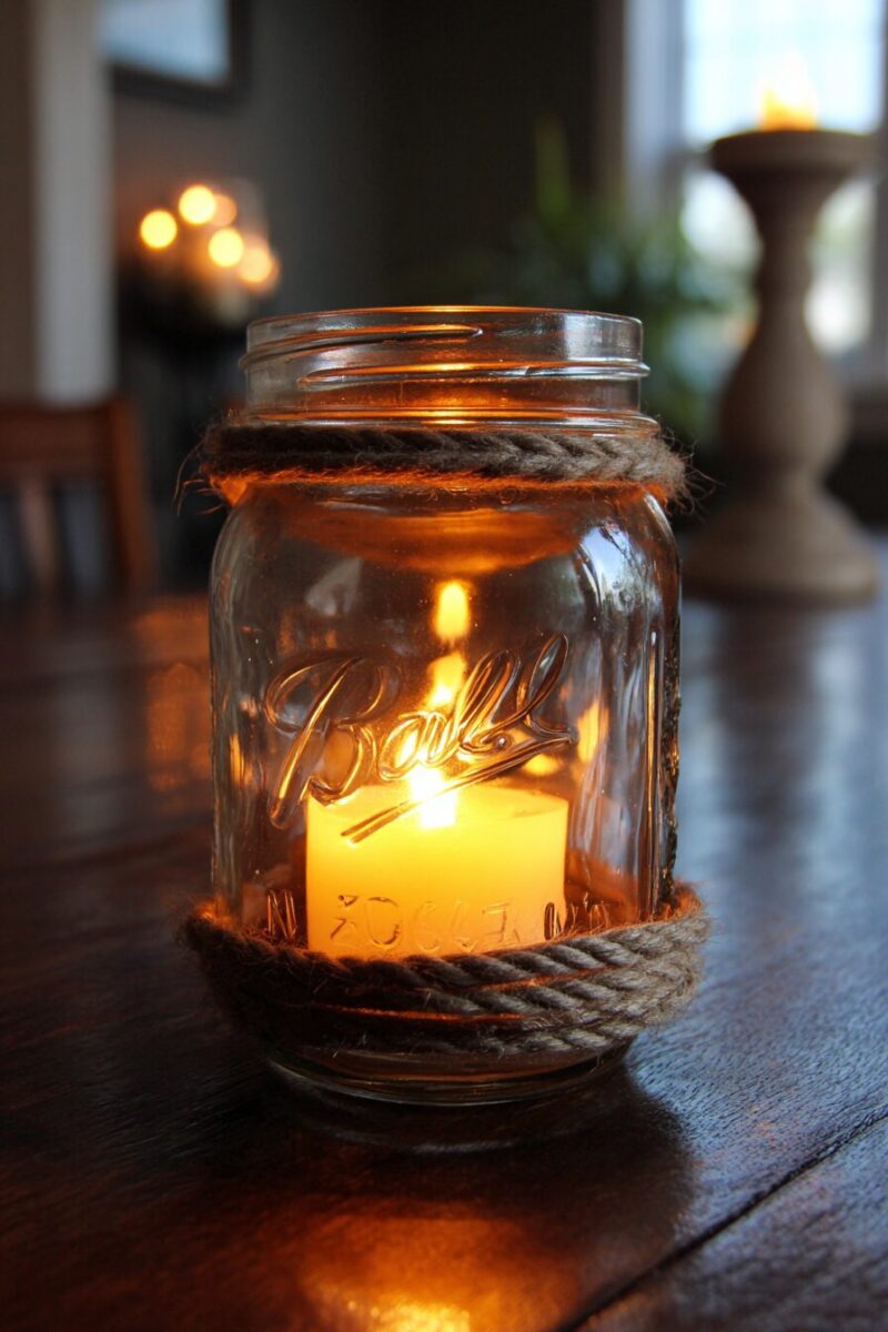 For a rustic look, wrap twine or jute around the jar’s neck and add dried flowers, pinecones, or seasonal elements attached with a simple glue gun.