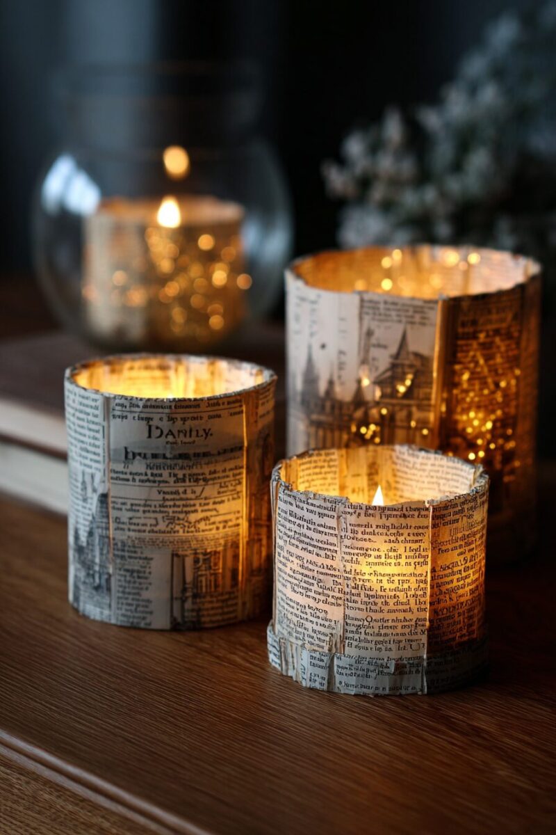 For an artistic approach, try folding the pages using basic origami techniques before assembling them into a three-dimensional structure around a glass candle holder.