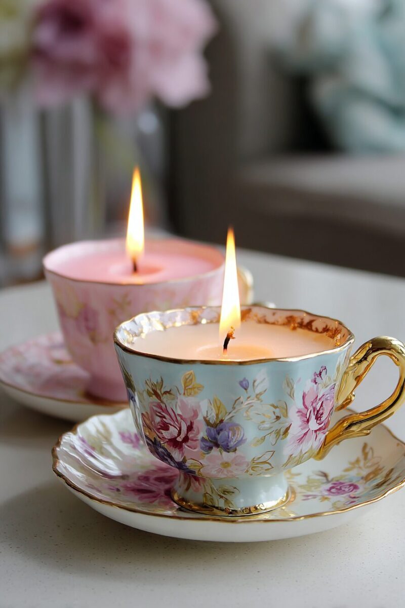 Vintage teacups from thrift stores or family hand-me-downs make particularly charming vessels for candles, bringing nostalgic elegance to any space.