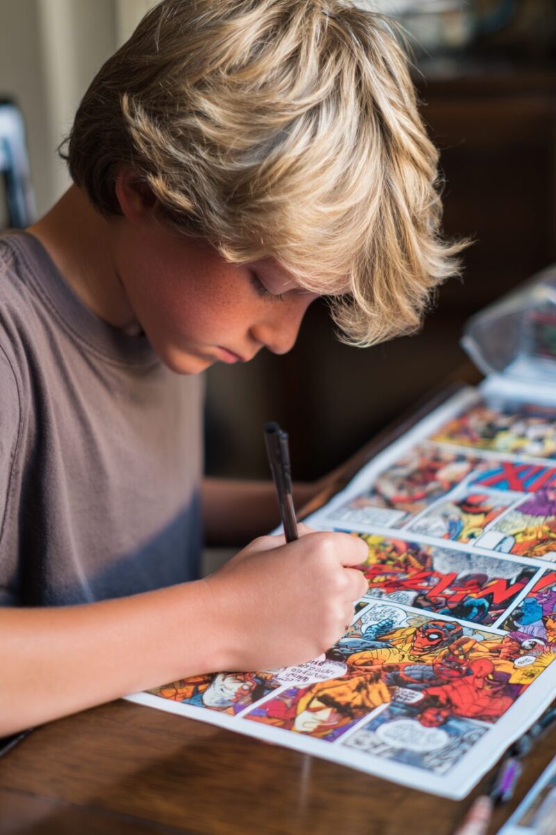 Start by gathering blank comic book templates – you can find free printable ones online or create your own using simple rectangles divided into panels.