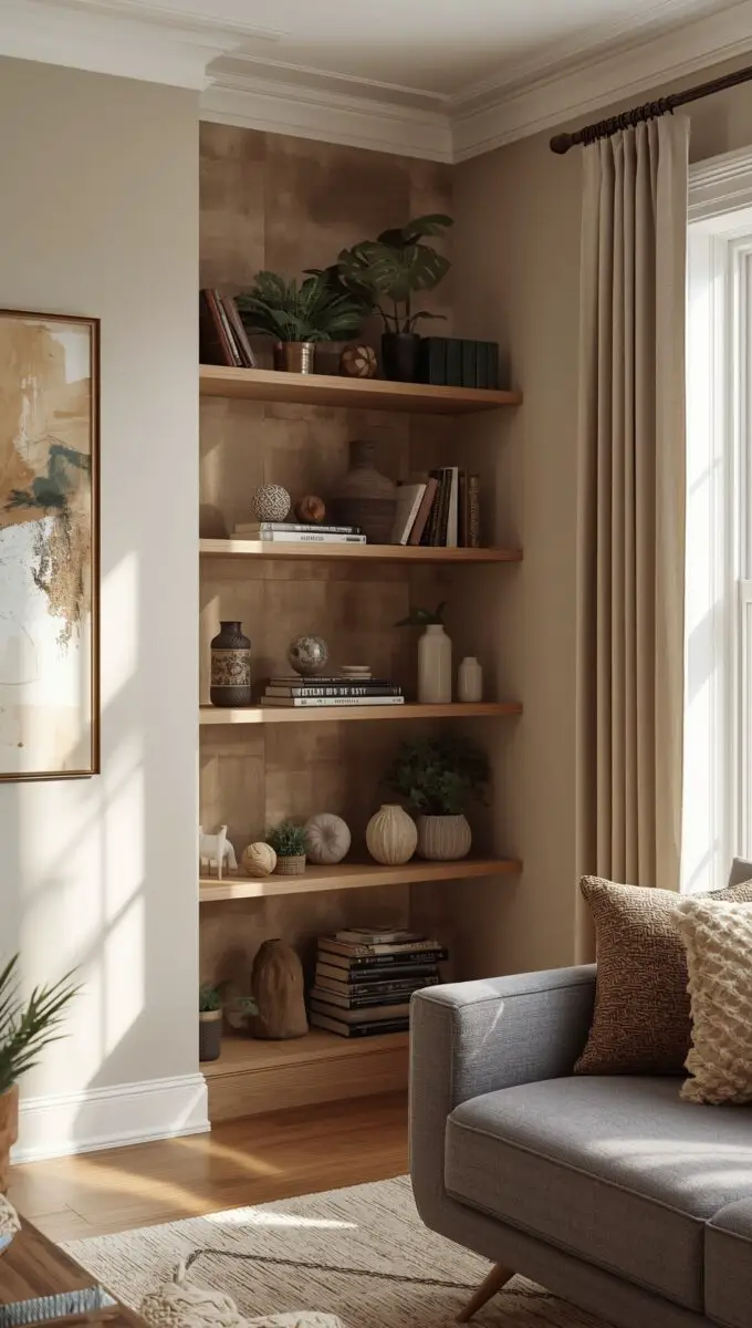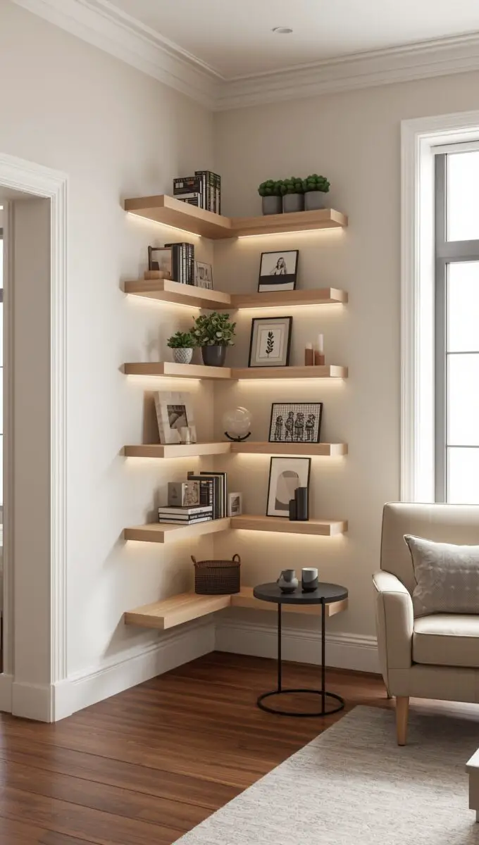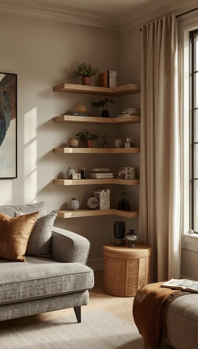 Corner floating shelves turn dead space into functional beauty.
