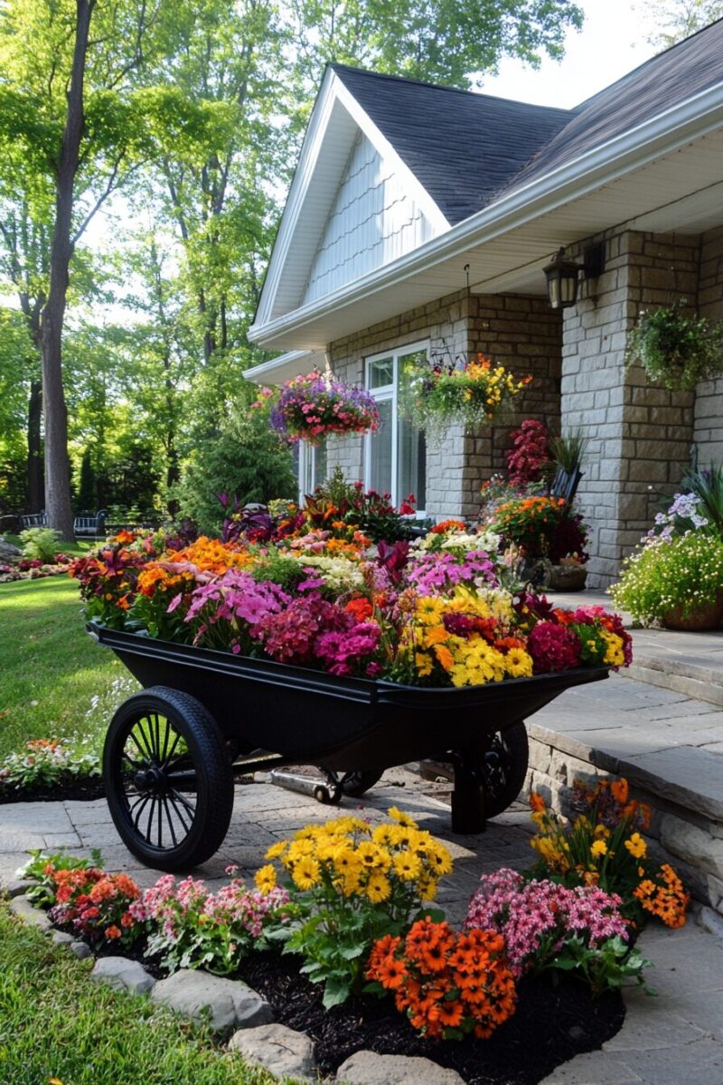 Color coordination transforms this idea from clever to spectacular – choose a cohesive color scheme or create deliberate contrast between the wheelbarrows and the flowers they contain.