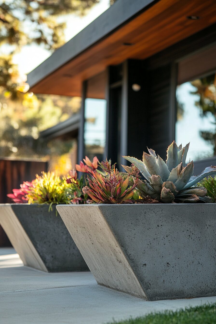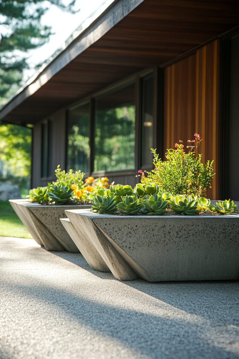 Plant selection becomes crucial with this style – choose specimens that create dramatic contrast against the hard lines of concrete, such as cascading succulents, ornamental grasses, or bright flowering annuals.