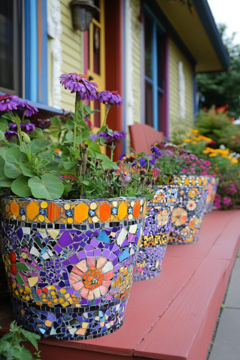 For cohesive design, incorporate colors from your home’s exterior into your mosaic patterns, creating visual harmony between house and garden.