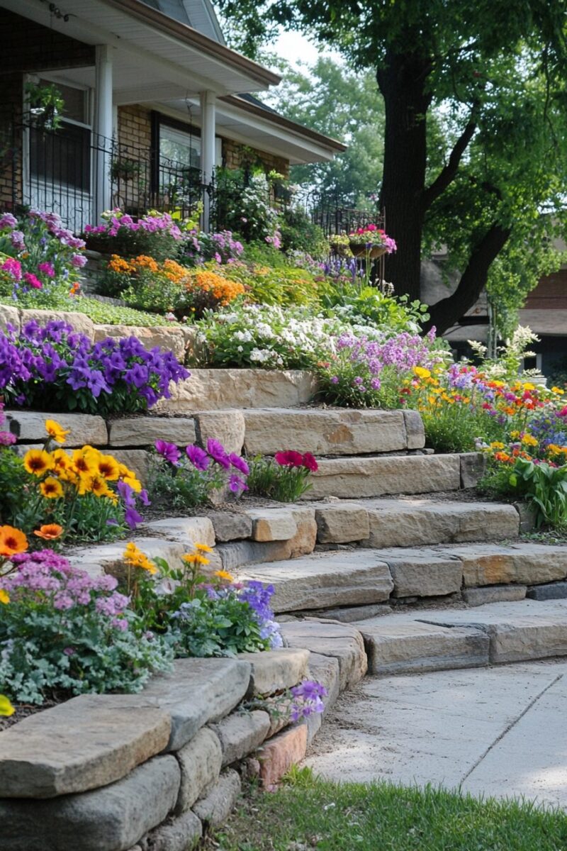 That sloped front yard that’s been nothing but a mowing hazard transforms into your property’s greatest asset when reimagined as a terraced garden.