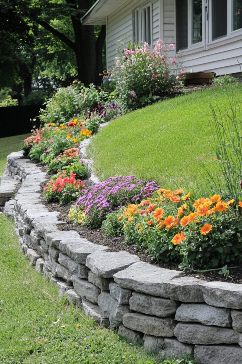 Cascading plants that spill over retaining walls soften hard edges and create visual connection between terraces – think creeping phlox, wave petunias, or ornamental strawberry.