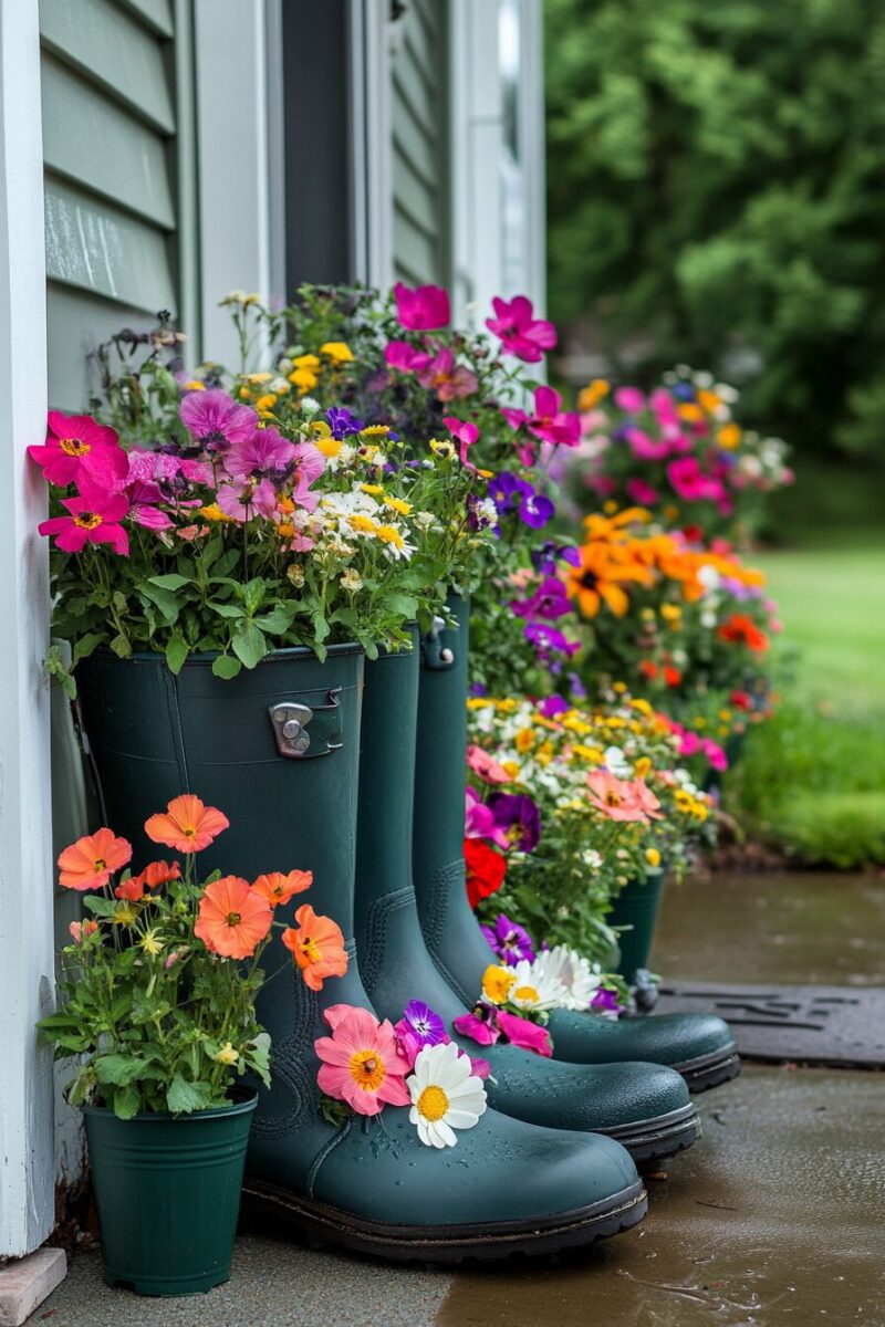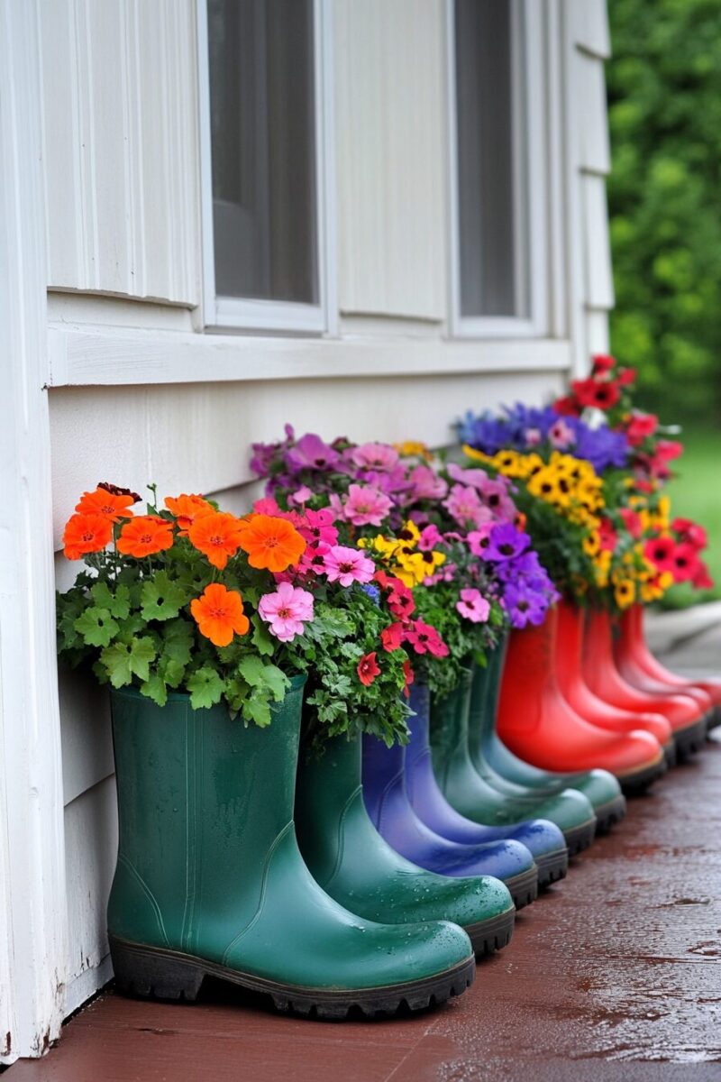 For cohesive design impact, coordinate flower colors with the shoes themselves – perhaps yellow blossoms spilling from yellow rain boots, or purple petunias from lavender clogs.