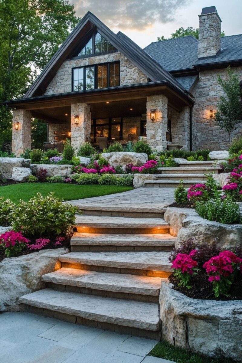 Nighttime brings another dimension to this garden feature – solar-powered lights placed strategically between stones create a magical illuminated pathway after sunset.