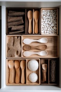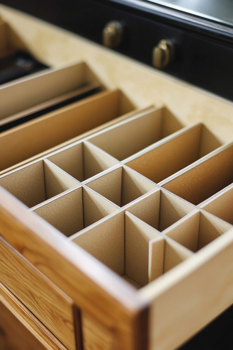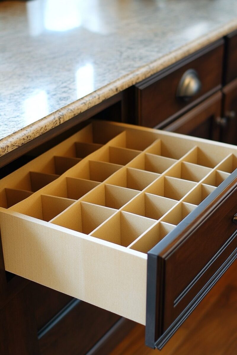 Create smaller compartments for items like measuring spoons and larger ones for bigger utensils.
