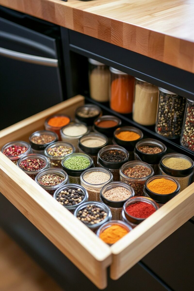 For easy access, organize the spices by frequency of use or by type (baking spices together, savory spices together).