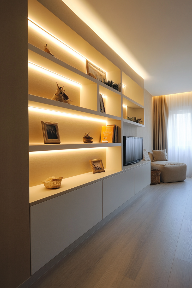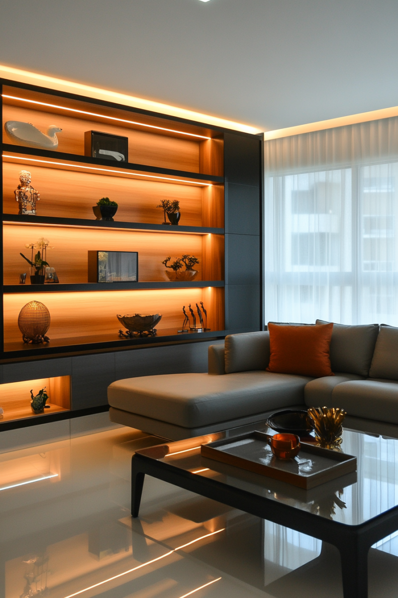Choose slender floating shelves that seem to defy physics and a matching futuristic coffee table.
