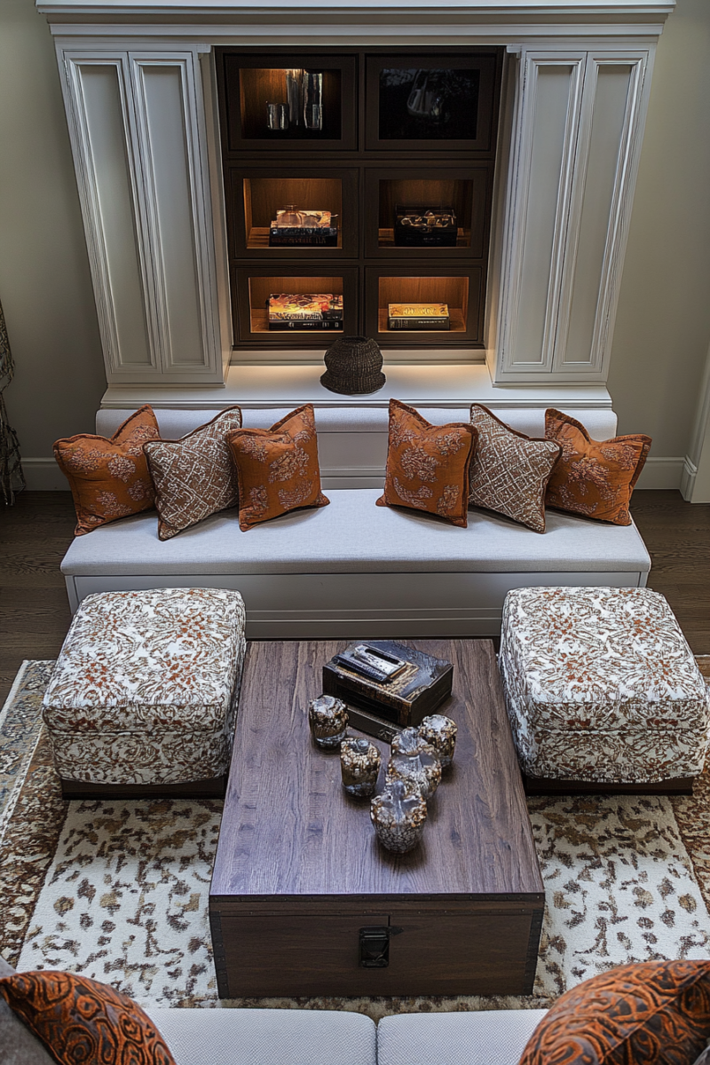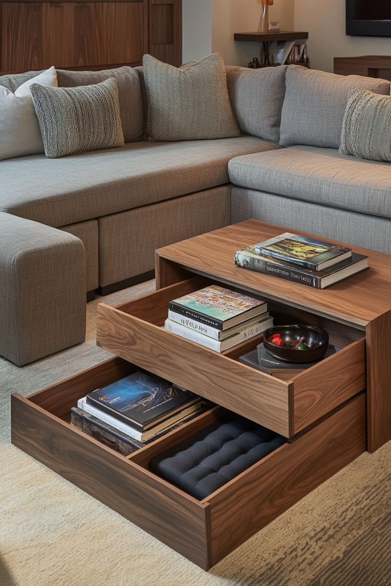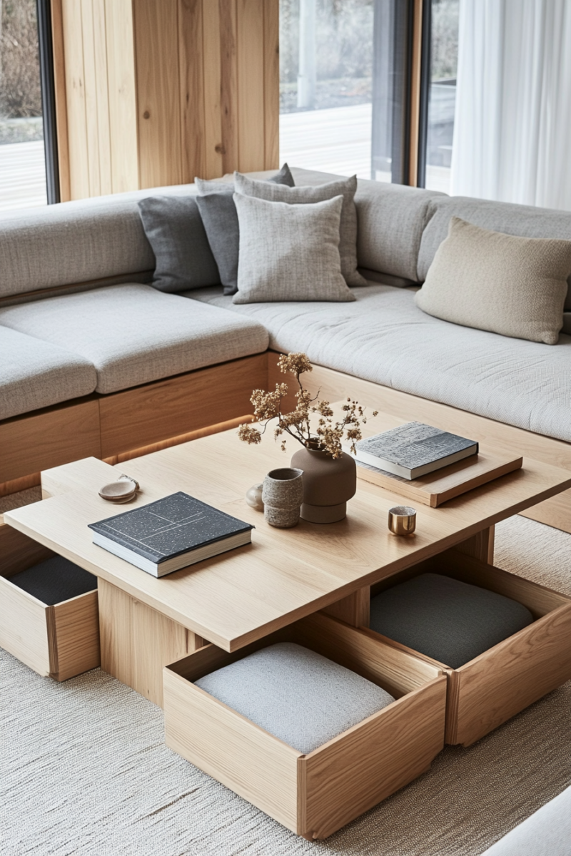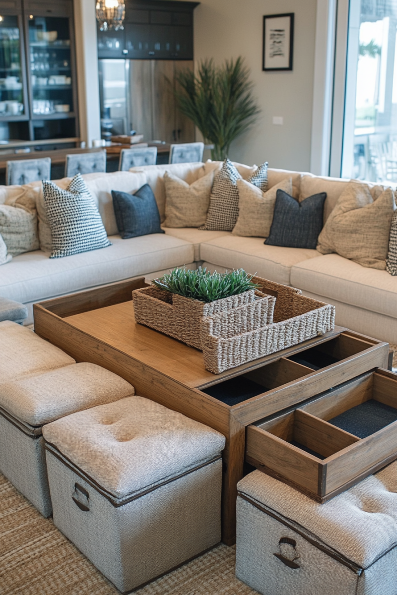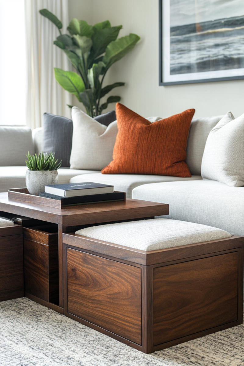 Ottoman coffee tables with storage, trays, and seating functions serve triple duty in living rooms where every square inch matters.