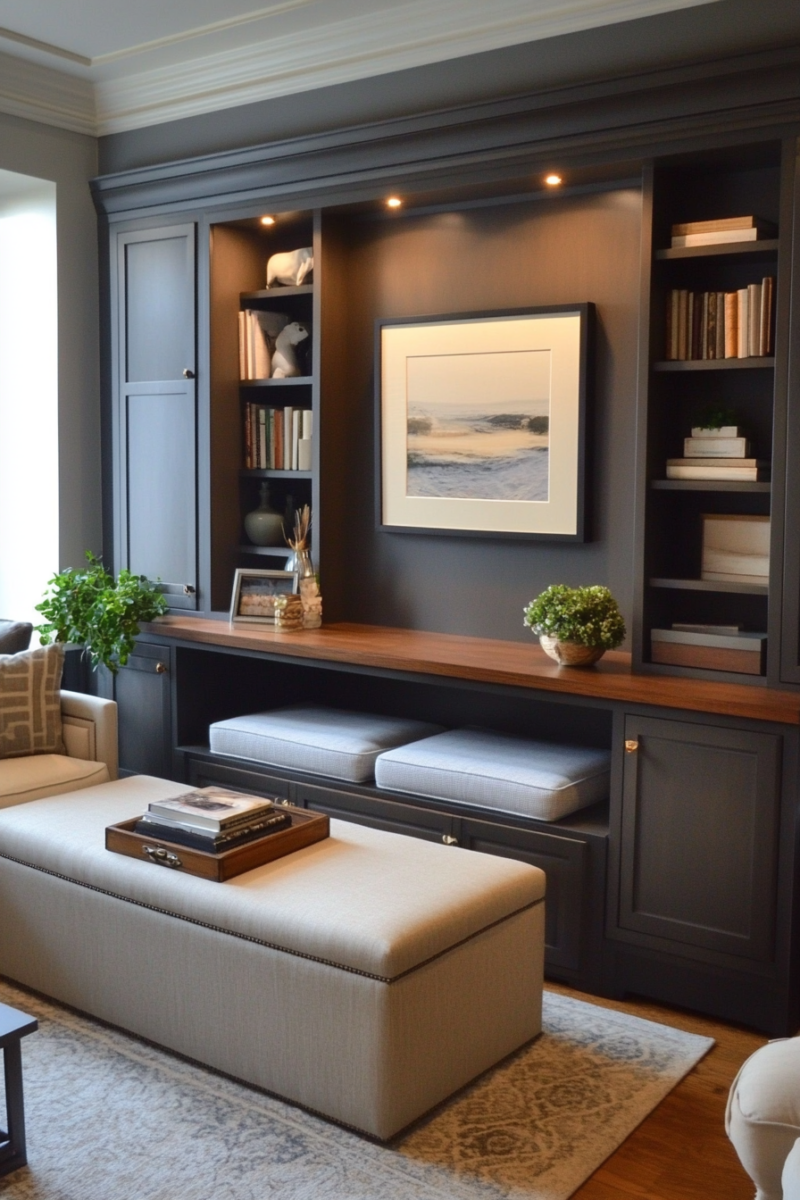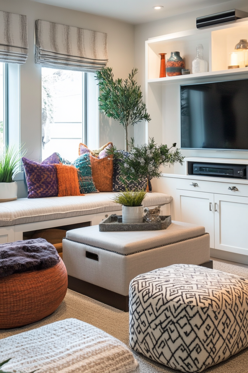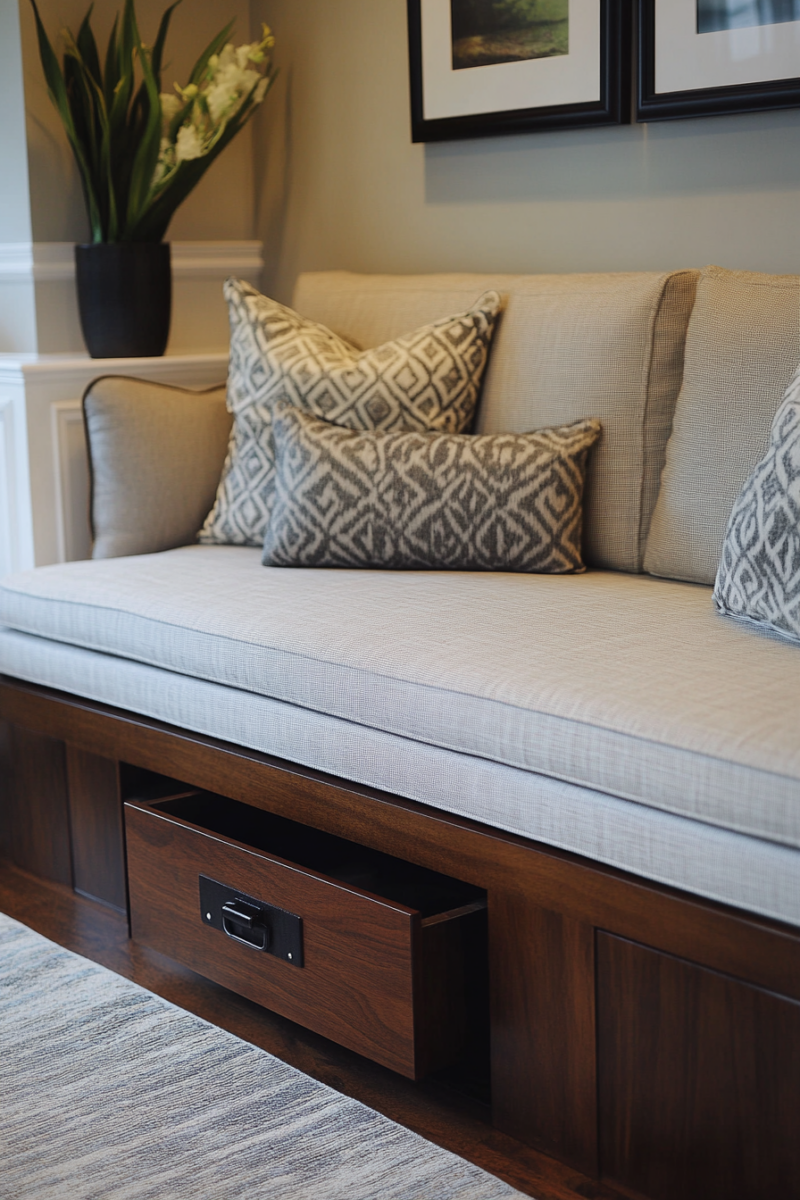 Storage benches placed under windows offer seating, organization, and often charging stations in one streamlined piece.