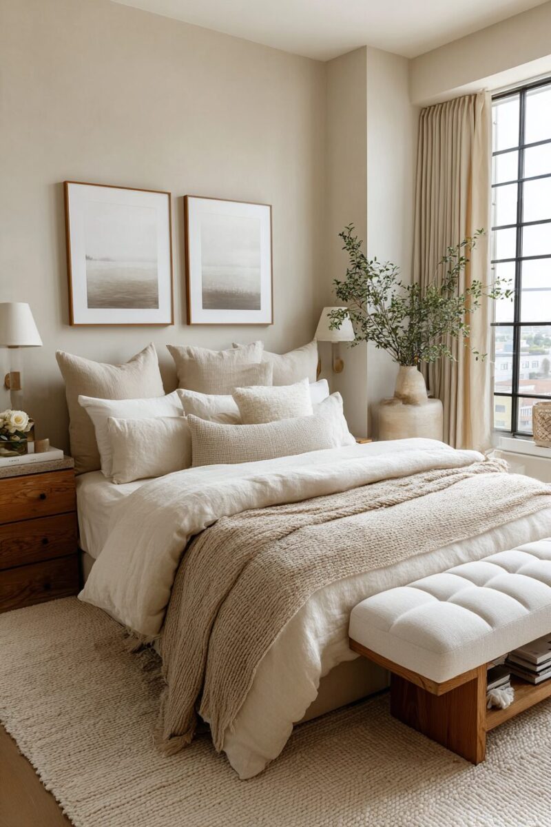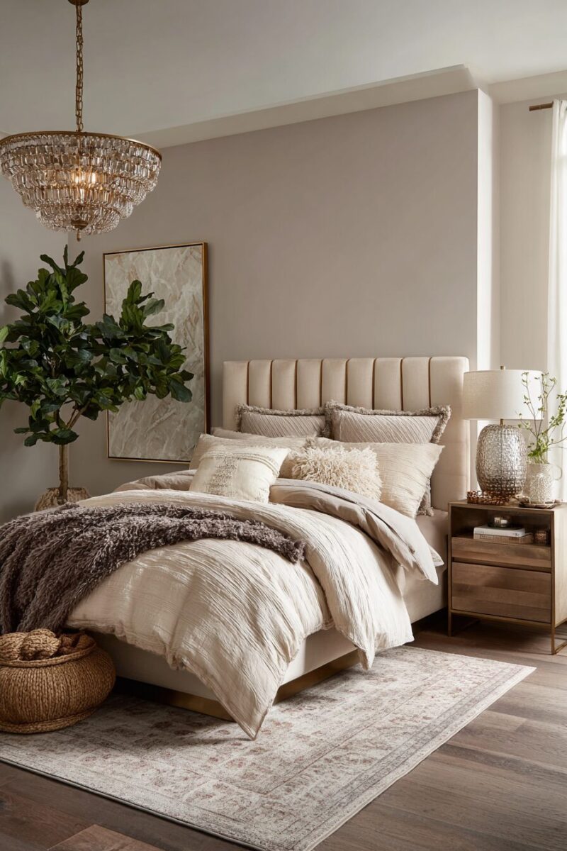 Natural textures become crucial in a beige bedroom – consider a chunky knit throw, a jute rug, linen curtains, and perhaps a rattan headboard to add visual and tactile interest.