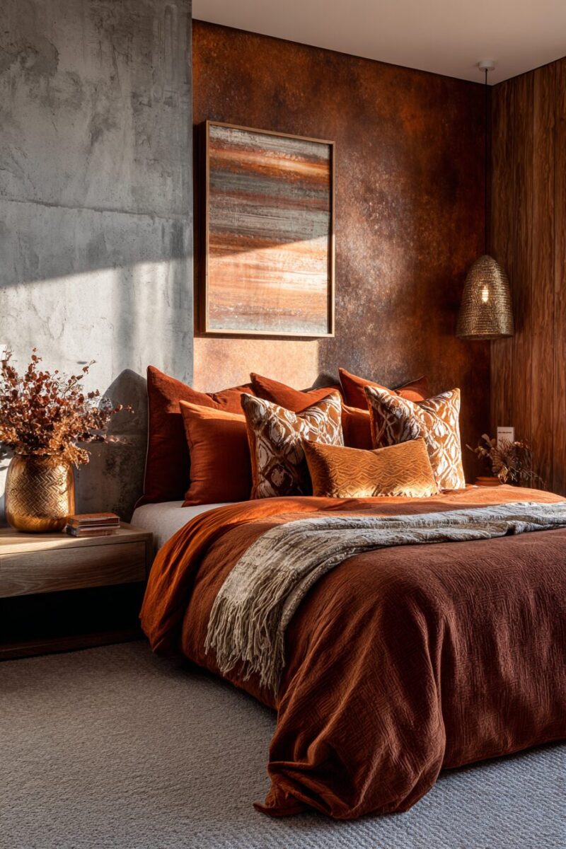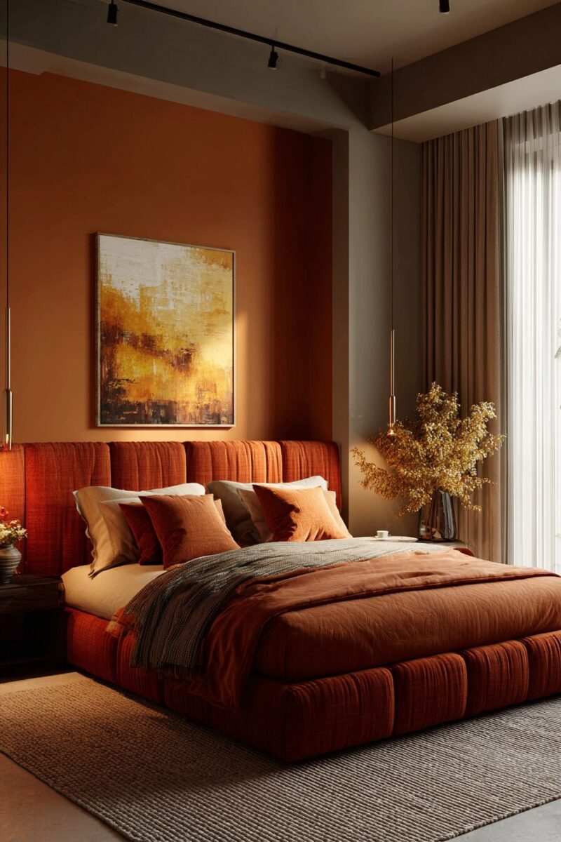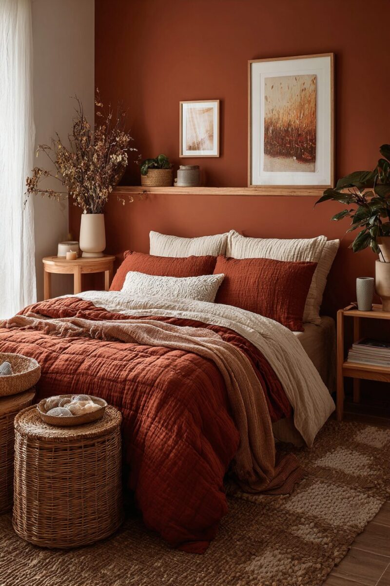 You can introduce this stunning earth tone through an accent wall behind your headboard, creating an instant focal point that draws the eye and anchors the entire room.