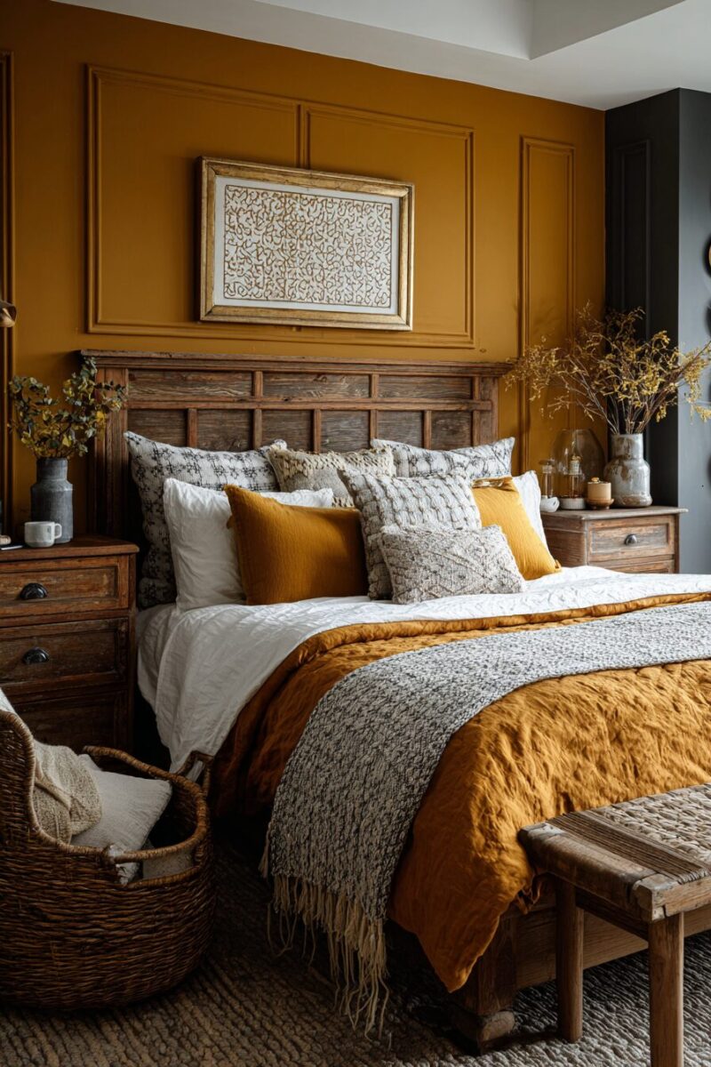 Mustard yellow brings an unexpected warmth and energy to your bedroom while maintaining the earthy, grounded quality that makes these color palettes so appealing and restful.