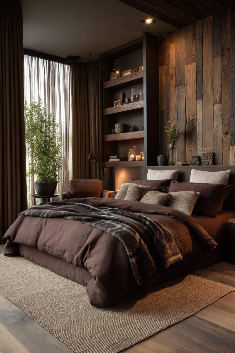 Deep chocolate brown creates an incredibly luxurious and cozy atmosphere that makes your bedroom feel like an upscale hotel suite crossed with a warm cabin retreat.