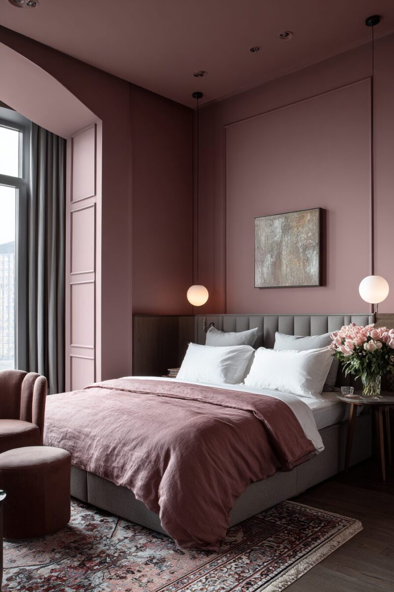 Dusty rose works particularly well in bedrooms with good natural light, where the color can shift and change throughout the day, appearing more pink in morning light and more gray in the evening.