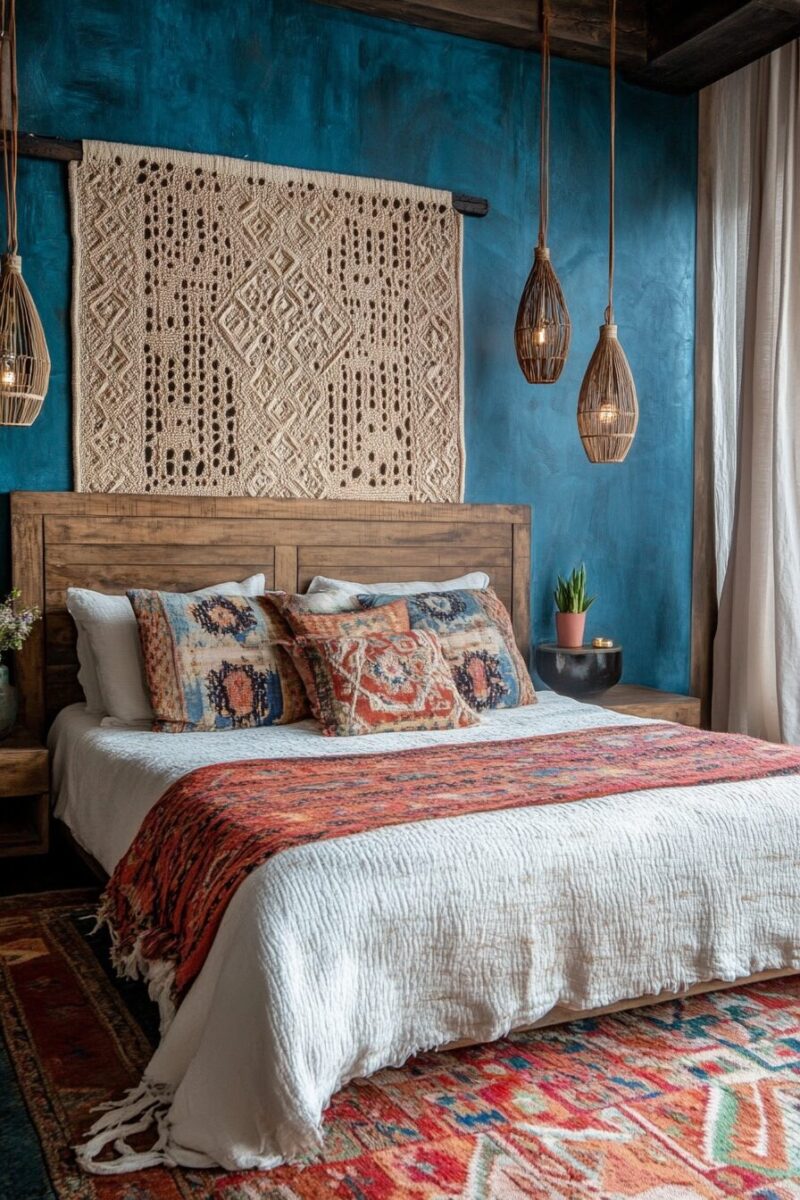Think beyond conventional headboards – perhaps a vintage room divider, a macramé wall hanging, or even an artistic arrangement of baskets could serve as your headboard.