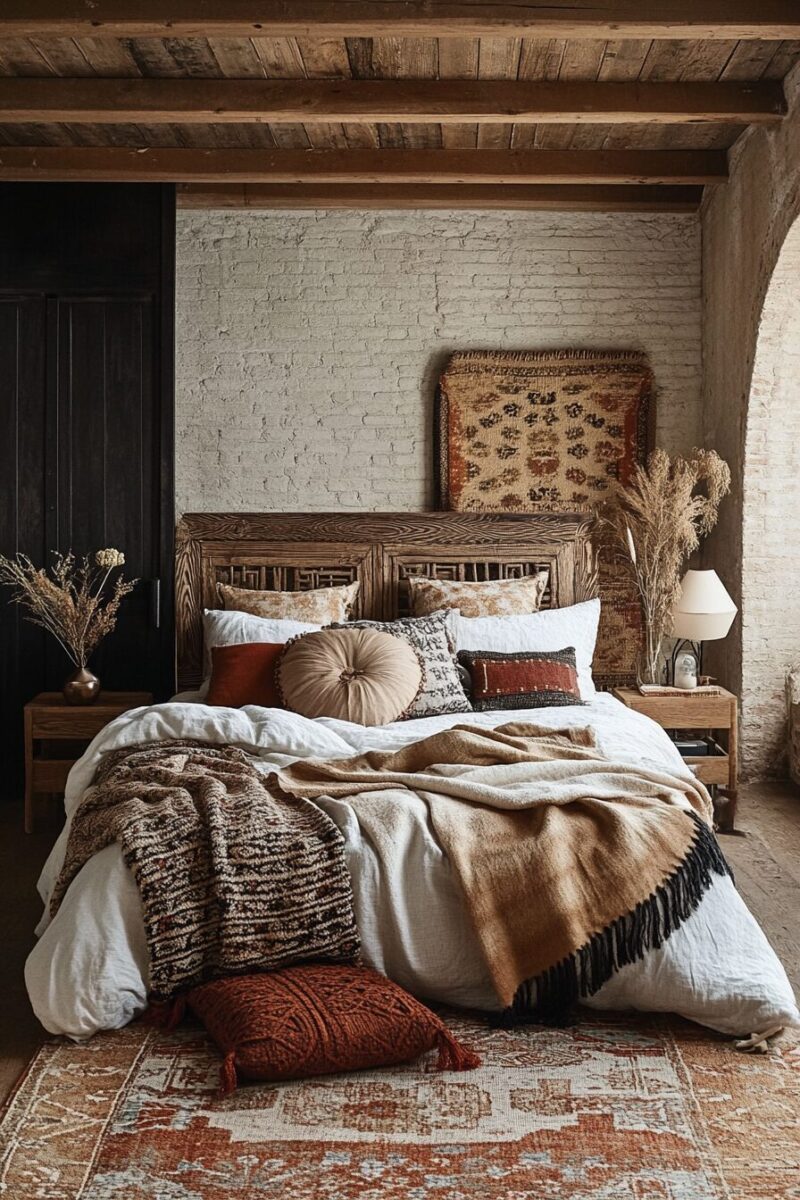 The bed is undeniably the star of any bedroom, and in earthy boho style, it becomes an artful expression of layered comfort.
