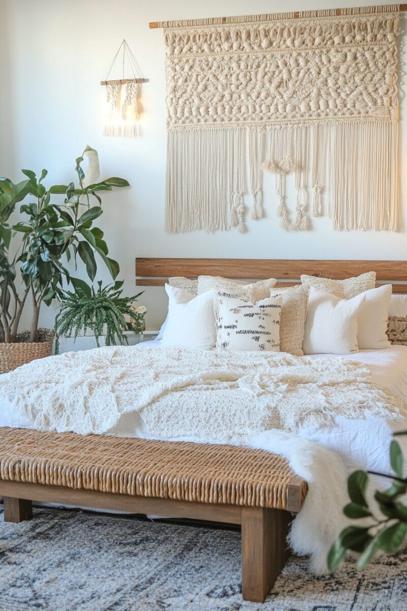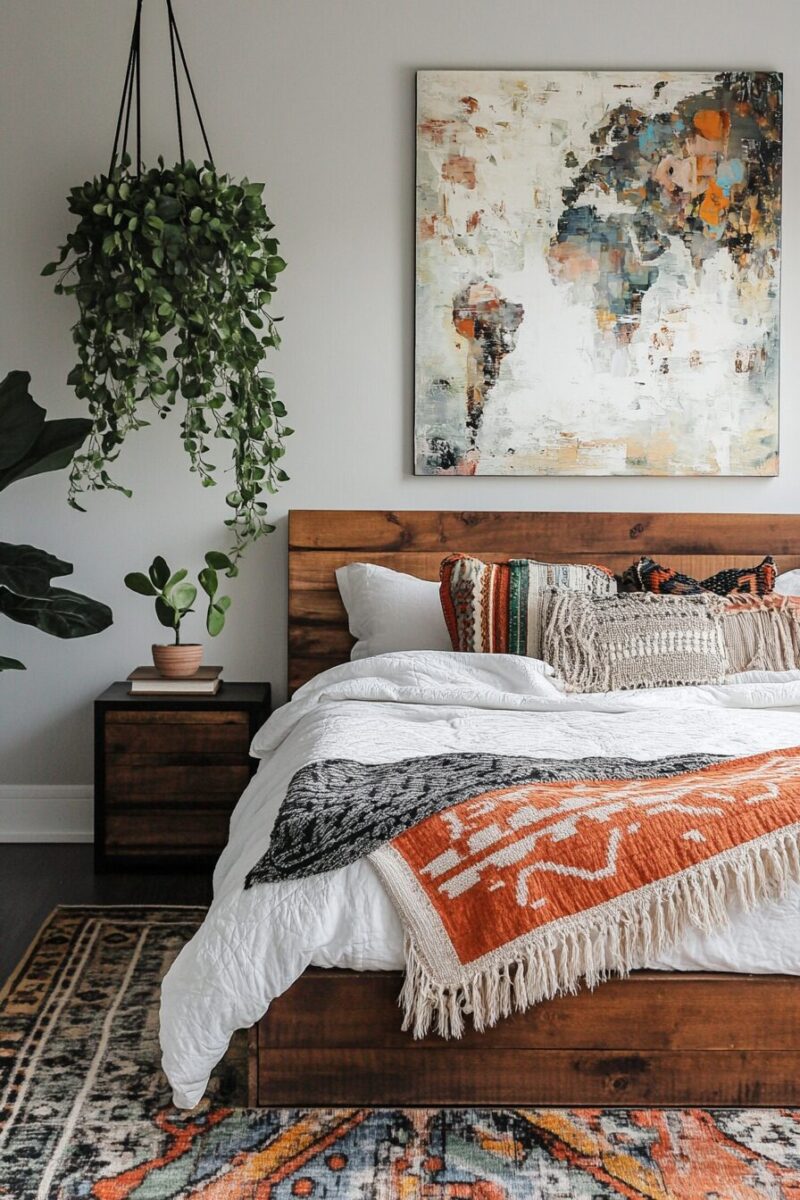 In an earthy boho bedroom, wall art isn’t just decoration – it’s an expression of your personal journey and values.