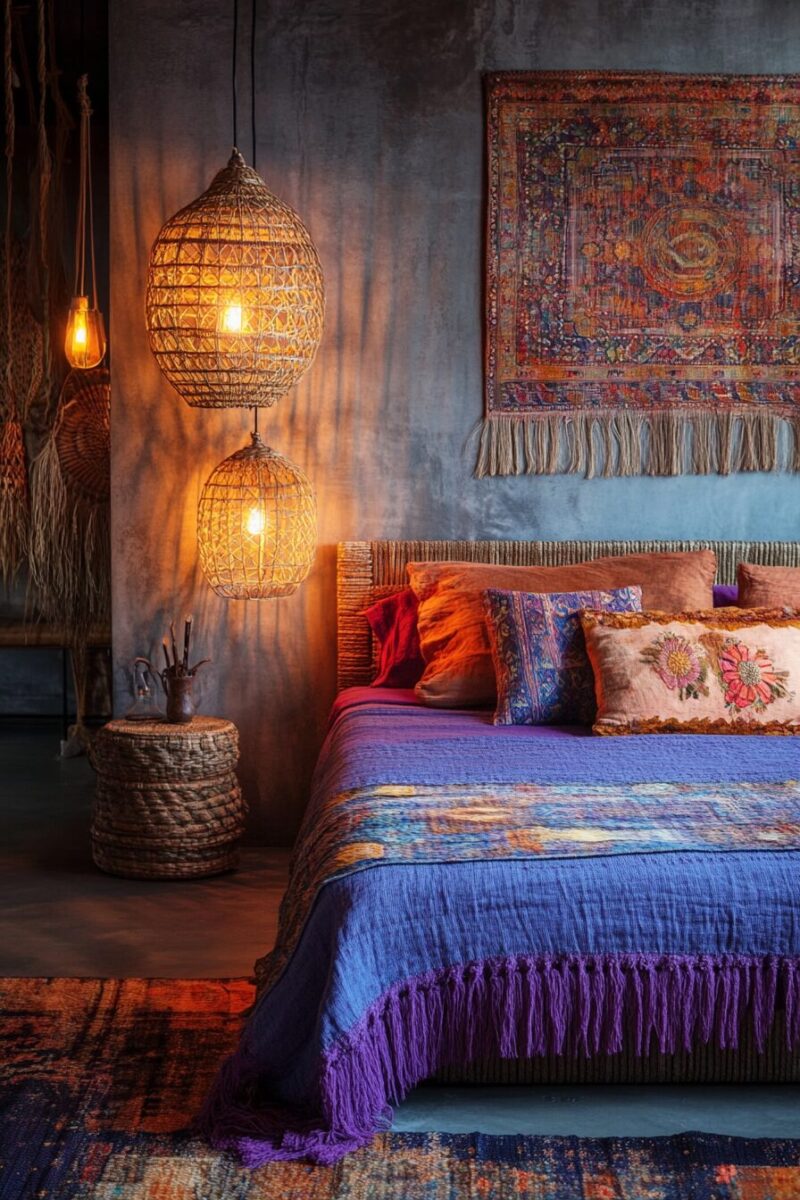 Create a statement wall behind your bed – perhaps with a large-scale tapestry, a collection of baskets arranged in a pattern, or a salon-style grouping of smaller artwork.