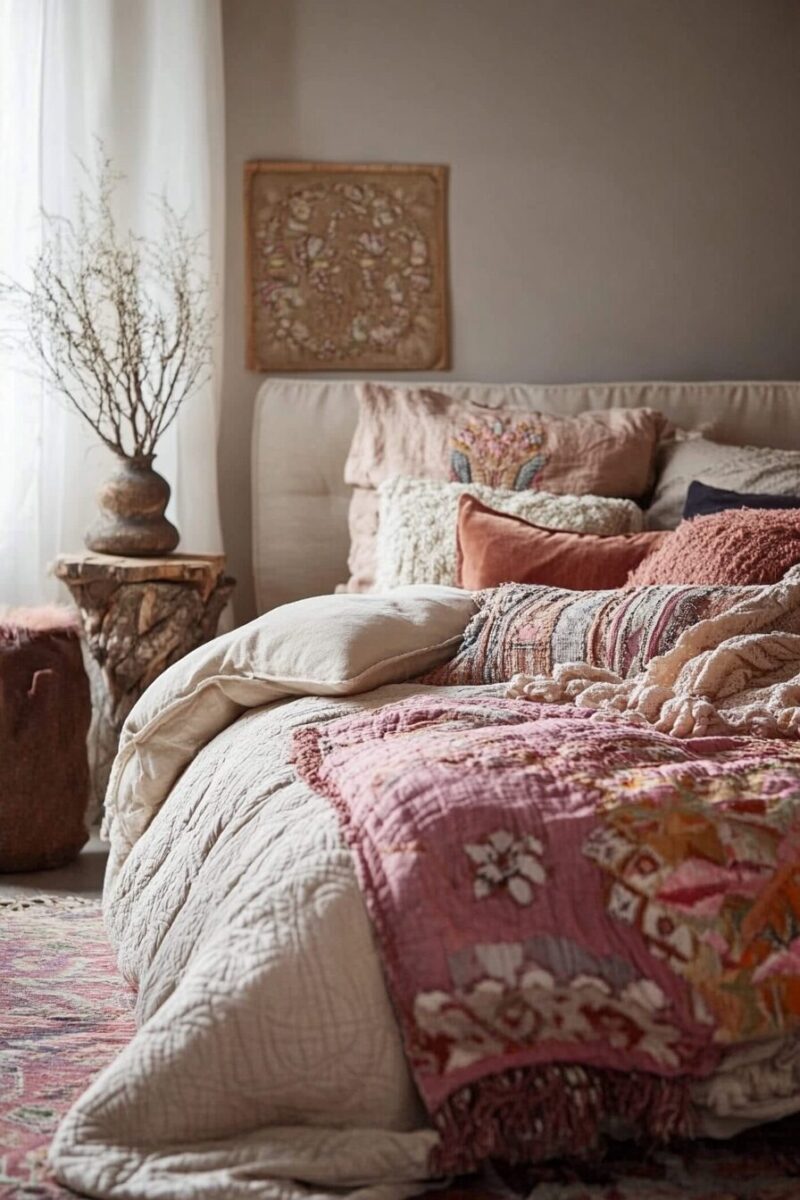 Add unexpected elements like a vintage textile as a throw, a handmade quilt folded at the foot of the bed, or even a beautiful scarf draped over a corner.