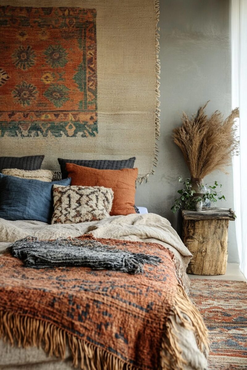 Layer different shades within the same color family for depth – perhaps a rust-colored throw blanket against caramel-colored bedding creates that perfectly imperfect boho look.