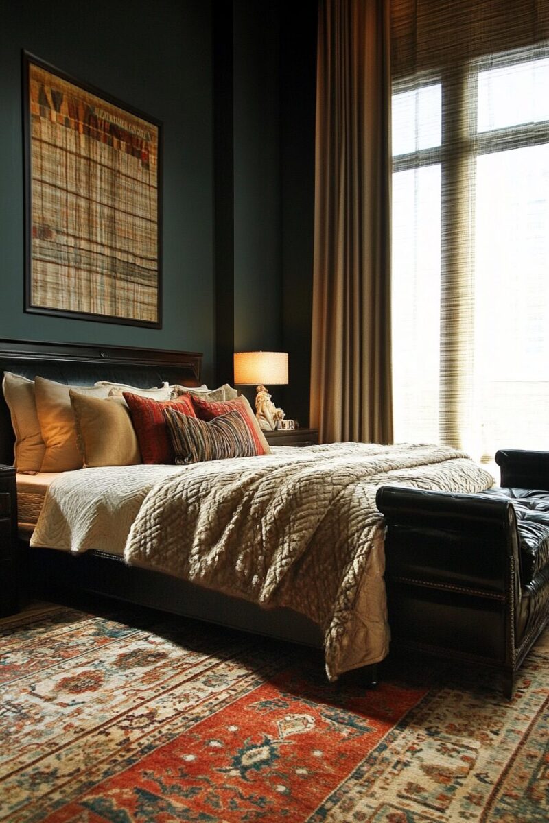 Incorporate leather elements – whether that’s a leather pouf, headboard, or even simple leather tiebacks for your curtains.