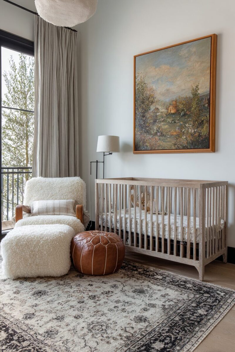 This combination creates a nursery that feels like a sophisticated art collector’s country retreat, warm and welcoming yet completely refined.