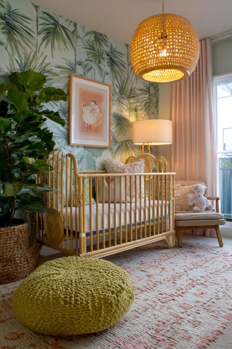 This design creates a nursery that feels like a luxurious tropical resort while remaining completely functional for everyday baby care and family life.