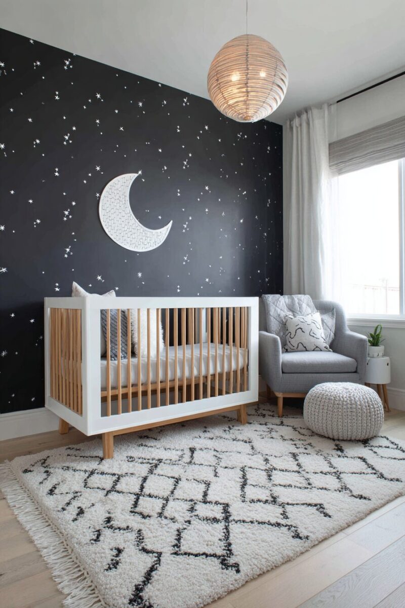 Begin with crisp white walls and add one dramatic black accent wall that immediately creates visual depth and sophistication in the nursery space.