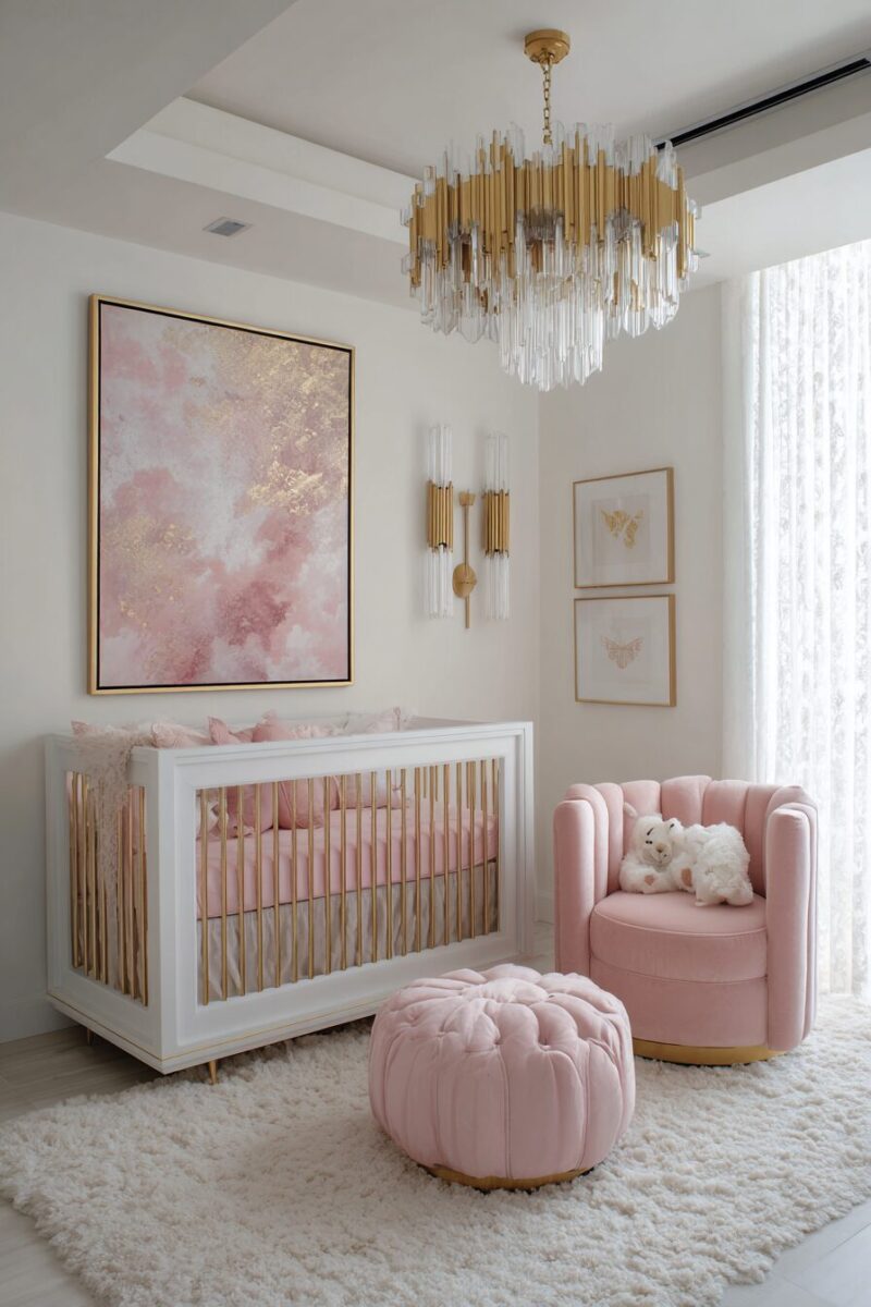 Picture walking into a nursery where a sleek white modern crib sits beneath a stunning vintage crystal chandelier from the 1940s.