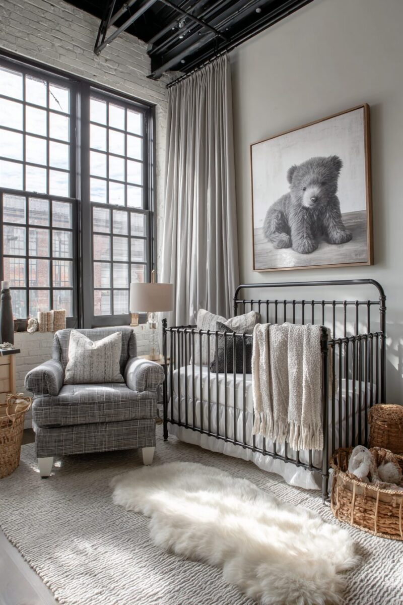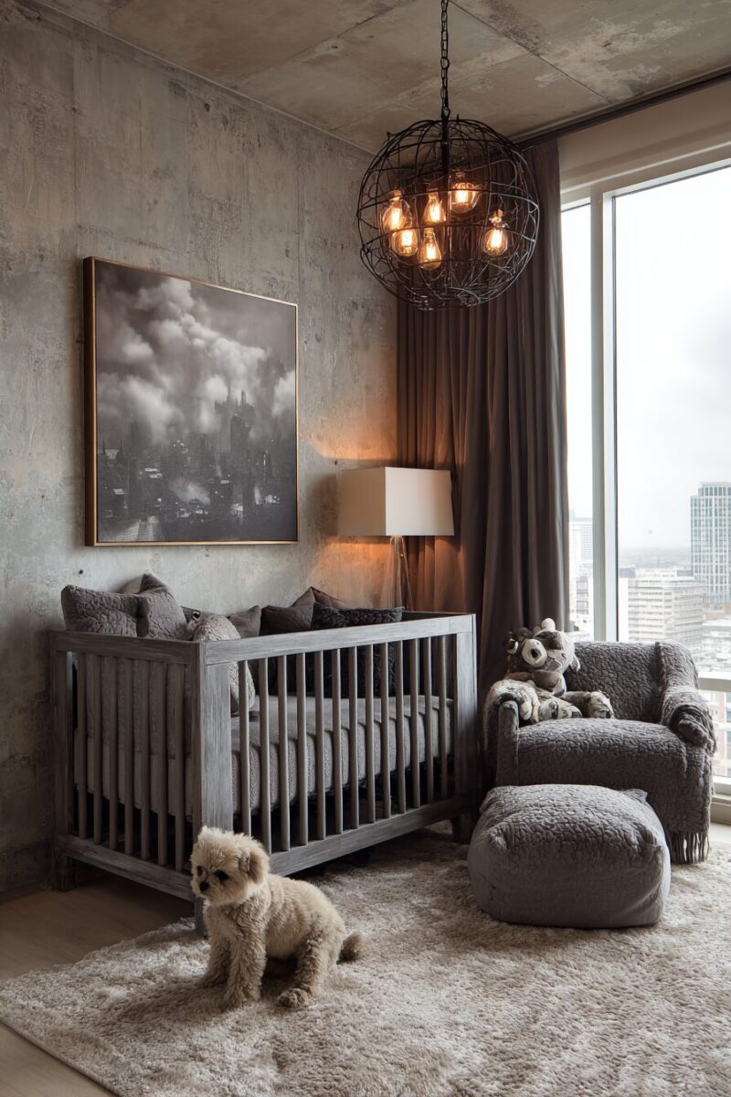 Transform raw industrial elements into a surprisingly warm and inviting nursery through the strategic use of soft textures and warm lighting.