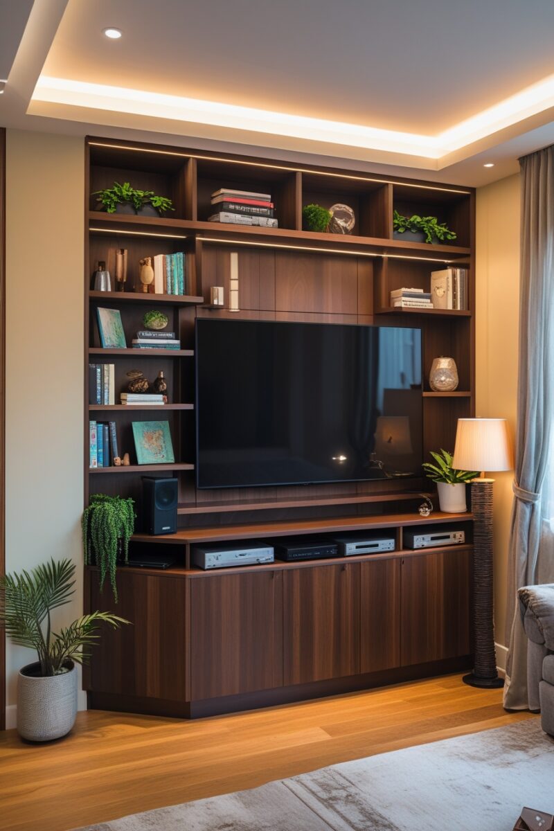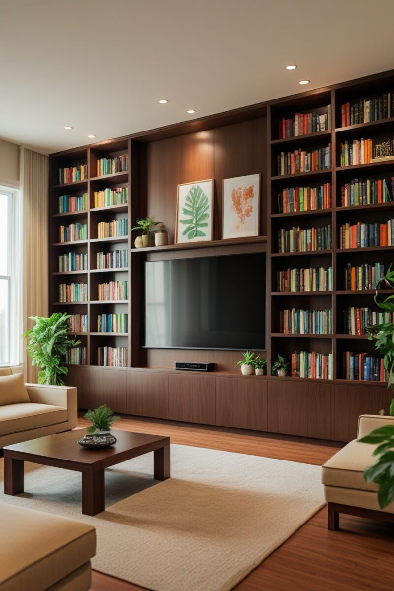 This approach turns standard entertainment storage into a floor-to-ceiling masterpiece that wraps around your TV like a warm embrace.
