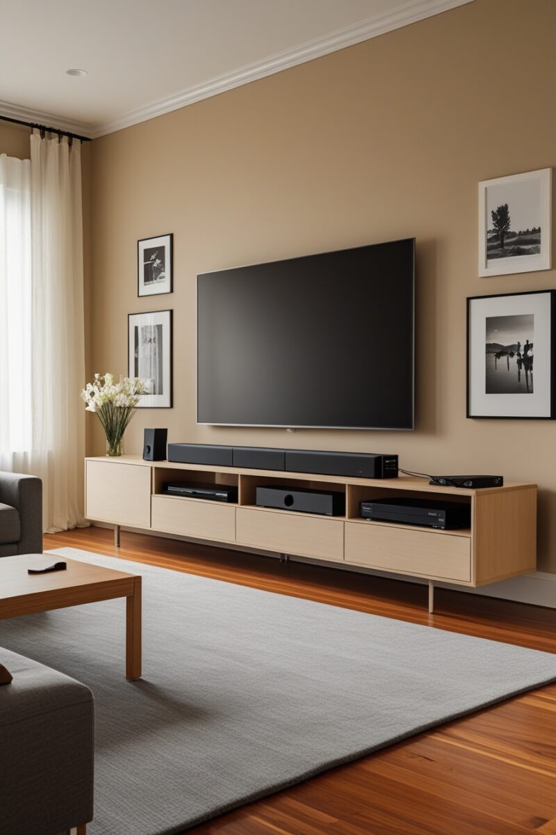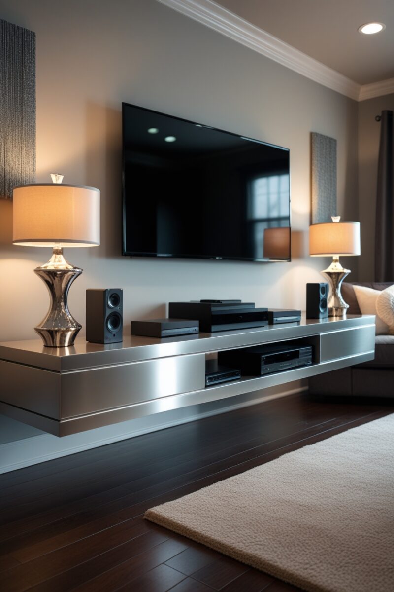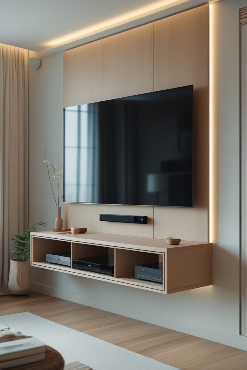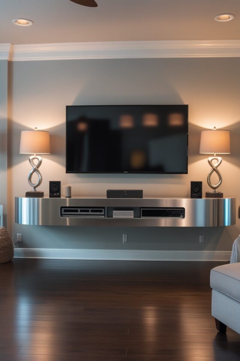 Floating entertainment centers create an optical illusion that makes your room feel twice as spacious while delivering serious modern sophistication.