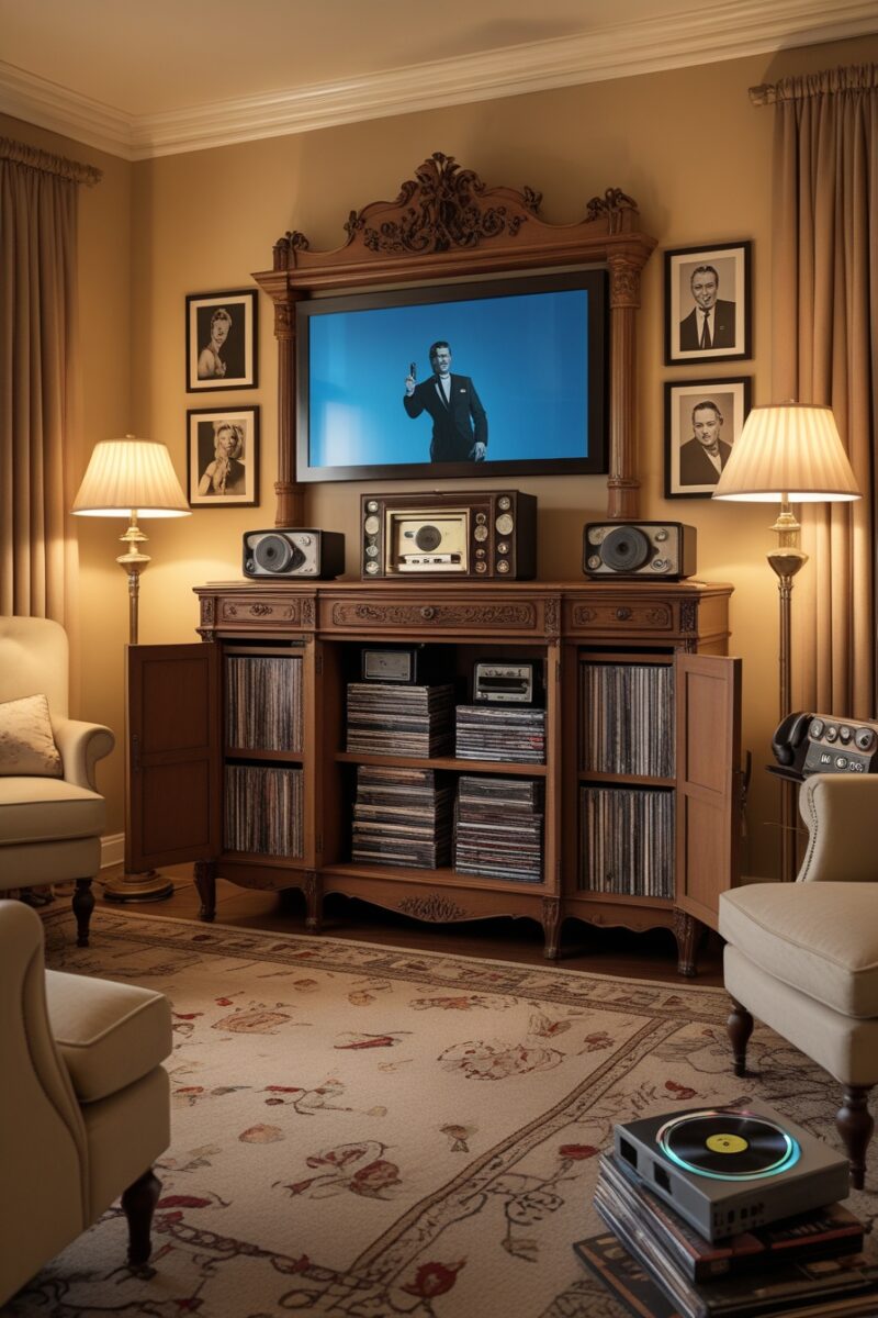 Your vintage entertainment center becomes a conversation starter and the anchor piece that defines your entire room’s aesthetic.