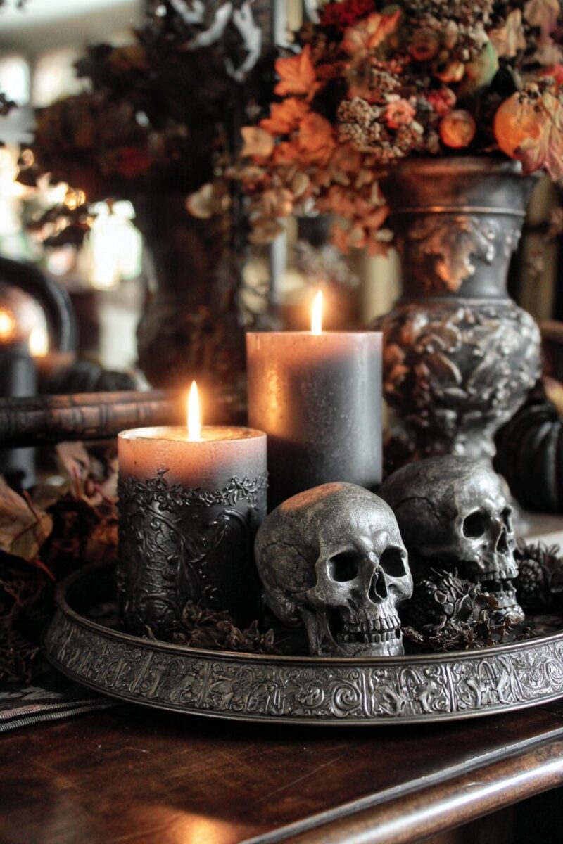 Add in one metallic item, like a gold skull or copper pumpkin, to balance the look.