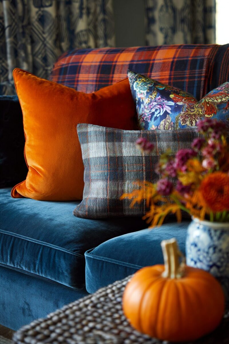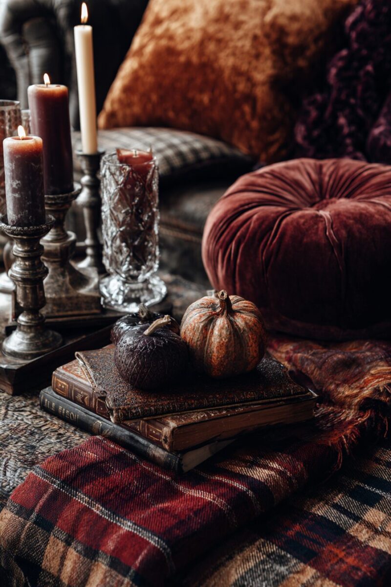 Try a trio of velvet pumpkins on your coffee table with a plaid throw nearby.